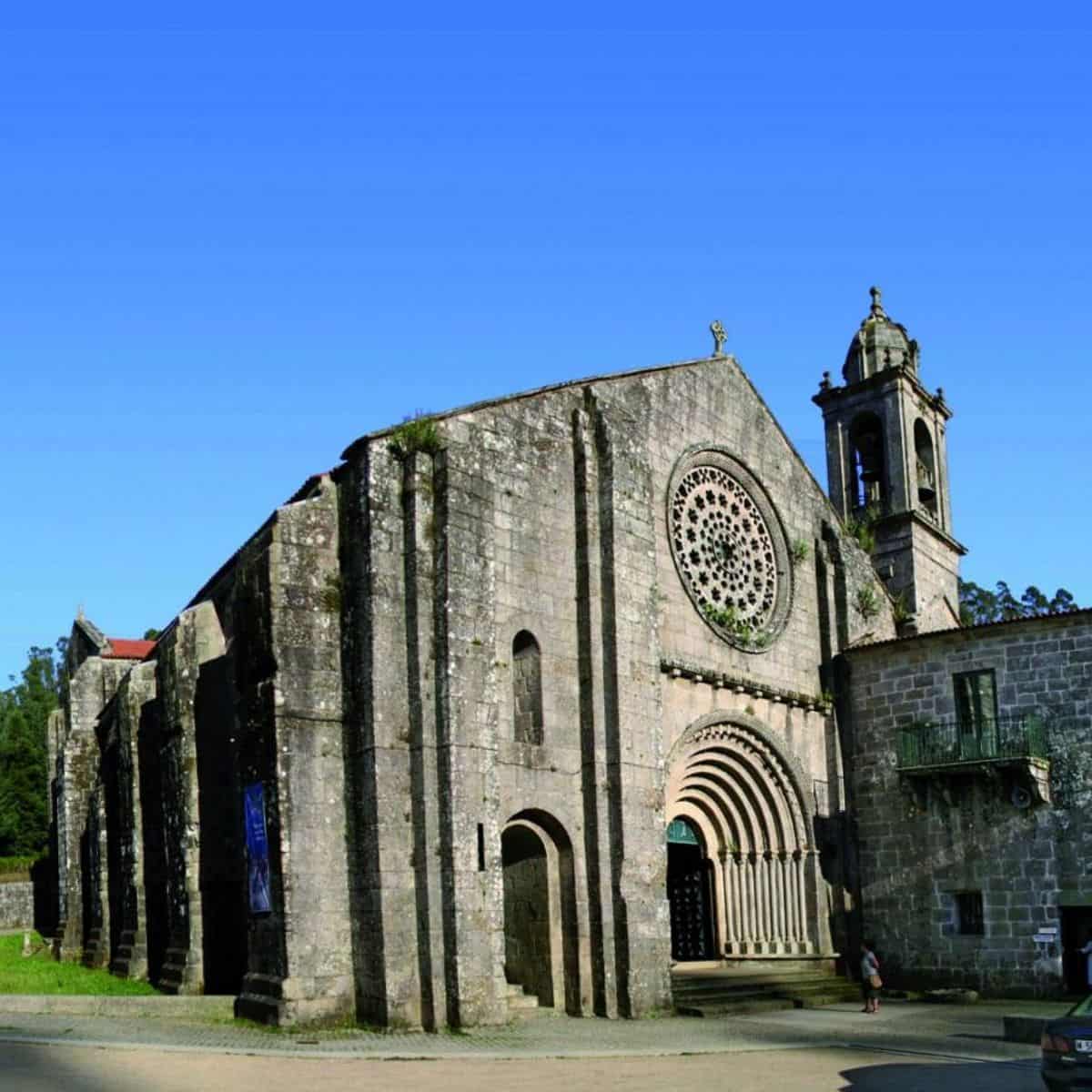 Rumo a O Salnés: São Pedro de Campañó (origem medieval, barroco no séc. XVIII), Mosteiro/igreja de San Xoán de Poio (BIC) e Combarro, com hórreos sobre o mar. Final no Mosteiro de Santa María de Armenteira (há 800+ anos, hoje com comunidade cisterciense).